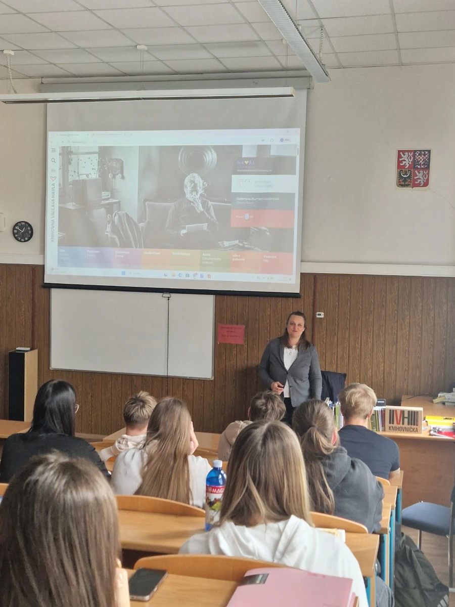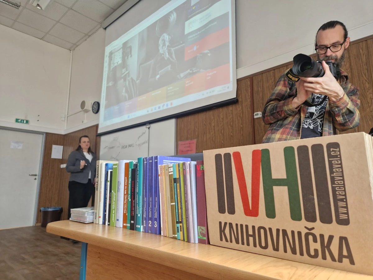 14.4. přivezla do naší školy Knihovna Václava Havla Knihovničku VH. Smyslem projektu je vytvořit na školách knihovničky, v nichž se nacházejí knihy a texty Václava Havla i texty související. Knihovnička obsahuje celou ediční řadu nakladatelství Knihovny VH (tedy přes 30 knih).